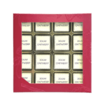 In de doos liggen 16 bedrukte bonbons met eigen logo, gevuld met romige hazelnoot-praliné en omhuld met zachte witte Belgische chocolade. Gemaakt van duurzame cacao van Barry Callebaut (Cocoa Horizons) — kwaliteit die je ziet én proeft.