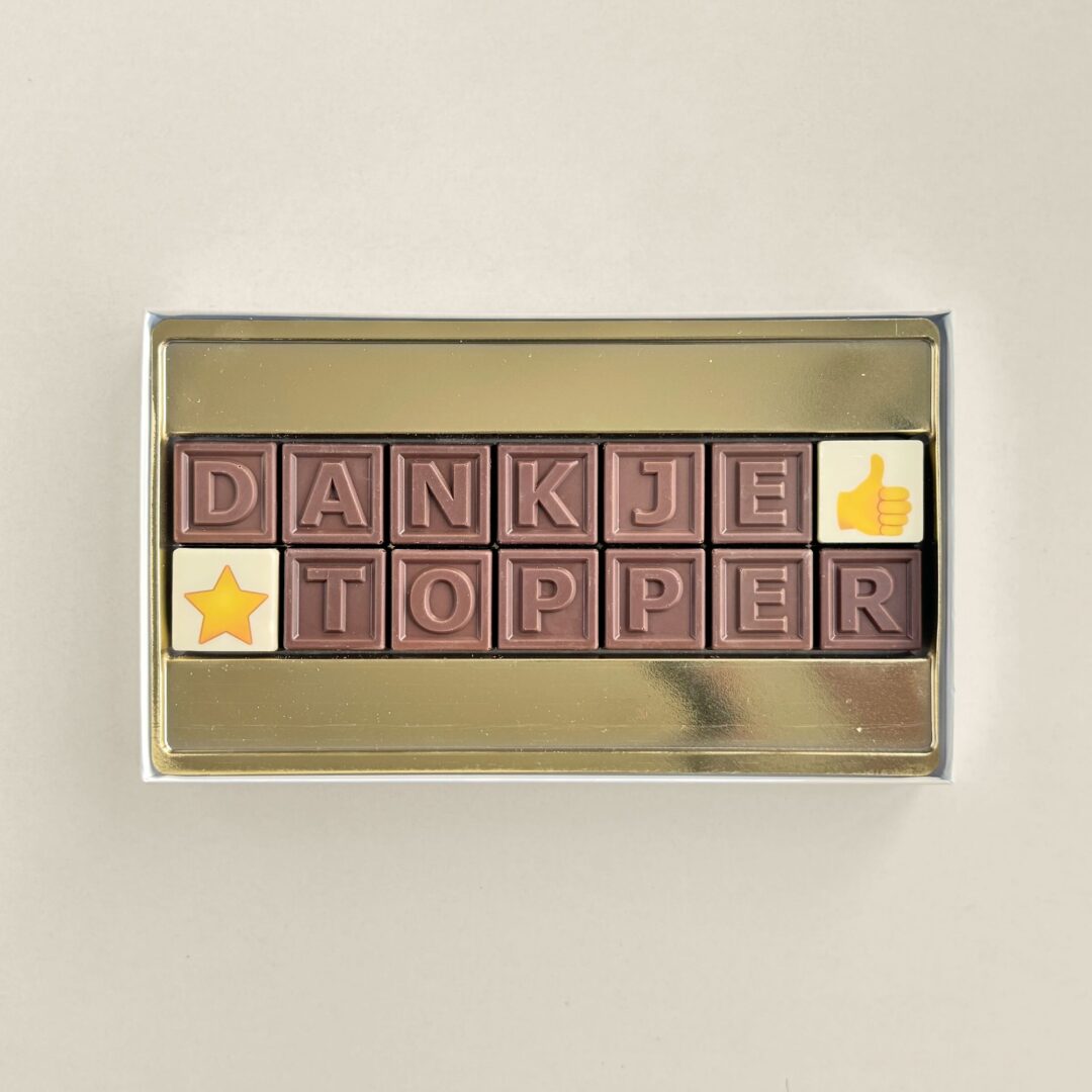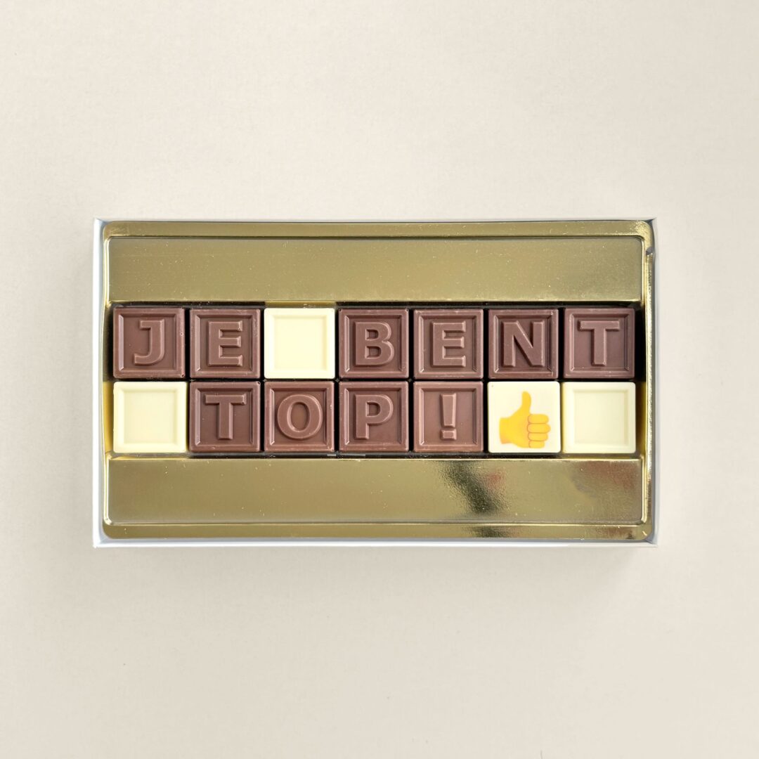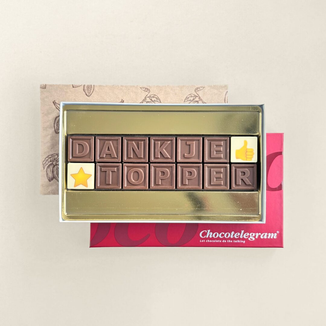 Vier een nieuwe stap met een origineel cadeau voor nieuwe baan. Met de ChocoTelegram® 14 met de tekst “nieuwe baan” geef je een persoonlijk en smakelijk chocolade cadeau met tekst.