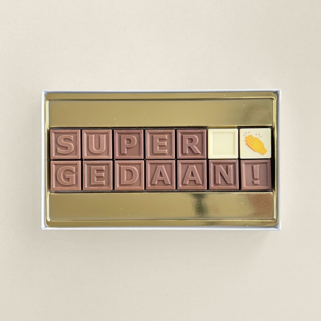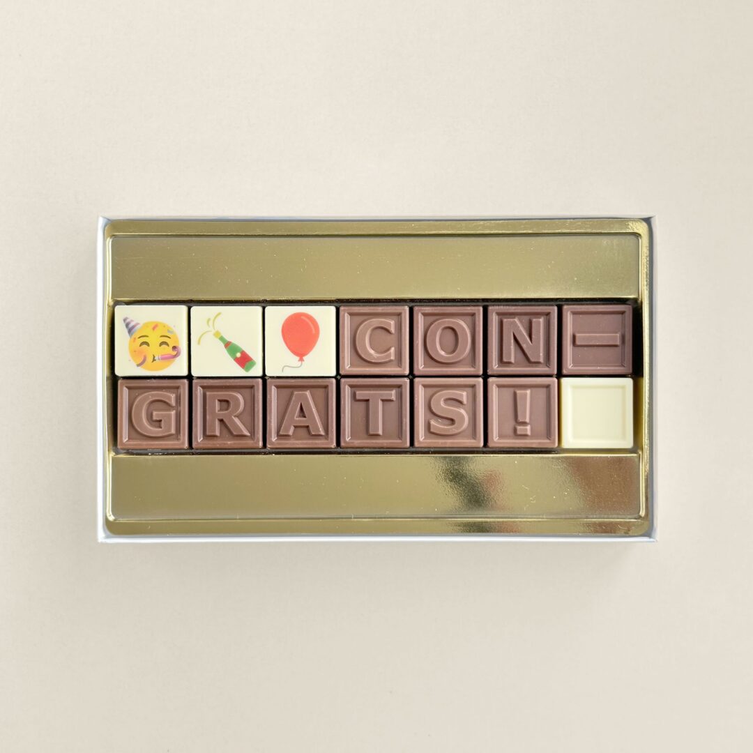 Versenden Sie dieses Weihnachten doch einmal ein Chocotelegram® anstelle der üblichen Karte! Mit 30 Schokoladenwürfeln wird der Text „Merry Xmas & a happy new year” gebildet. Auf einem Würfel können Sie Ihr Firmenlogo oder ein Foto platzieren. Das Ganze wird festlich in einer schönen Geschenkbox verpackt.
