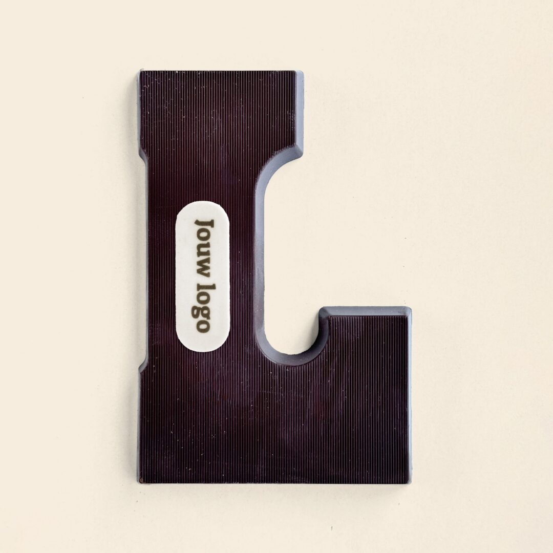 Ihr Foto, Firmenlogo oder persönlicher Wunschtext auf einem Buchstaben L aus dunkler Schokolade, mittels einer Marzipanplakette (7 x 2,5 cm). Der dunkle Buchstabe wiegt 200 Gramm, wird in einer luxuriösen roten Geschenkbox verpackt und besteht aus nachhaltig produzierter belgischer Cocoa Horizons-Schokolade.
