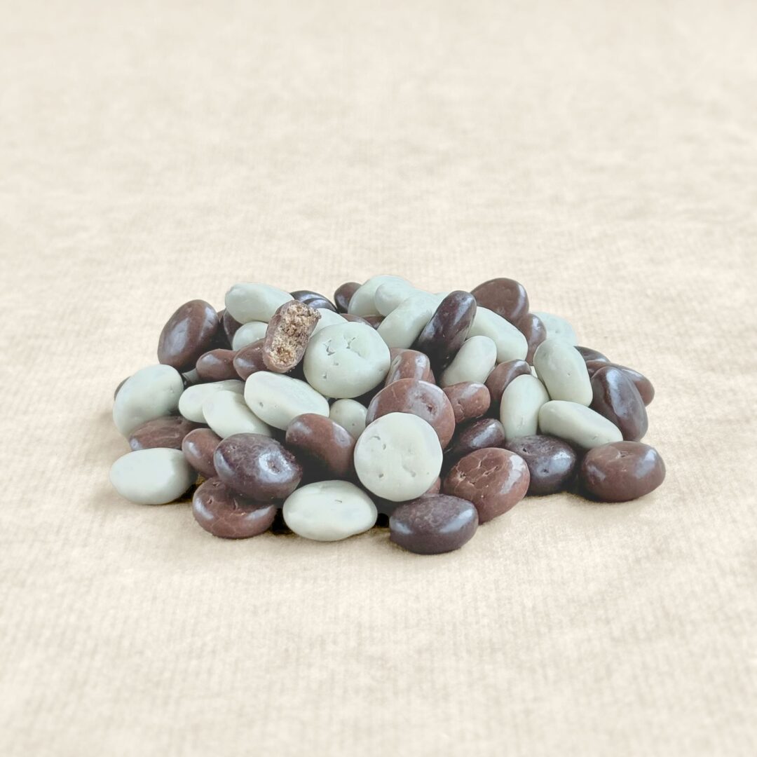 Ein goldenes Tablett gefüllt mit 150 Gramm luxuriösen Schokoladen-Kräuterplätzchen in einer Mischung aus Milch-, weißer und dunkler Schokolade. Ein echtes holländisches Vergnügen. Das Ganze ist in einer luxuriösen Fensterbox verpackt. Ein Nikolausbrief, aber anders.