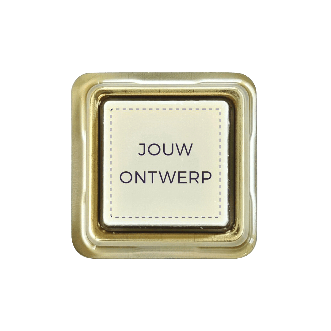 De bedrukte chocolaatjes worden individueel verpakt in een luxe gouden tray met transparante deksel. Dit maakt ze ideaal als uitdeelcadeau op beurzen, evenementen of als stijlvolle presentatie op een receptiebalie.