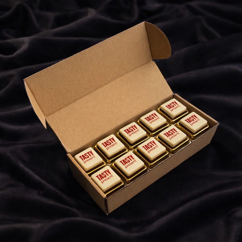 Elk chocolade blokje met logo is gemaakt van een laagje witte en melkchocolade en wordt bedrukt met jouw bedrijfslogo, tekst of afbeelding. Dankzij een geavanceerd printproces met eetbare kleurstoffen wordt iedere afbeelding haarscherp op de chocolade weergegeven.