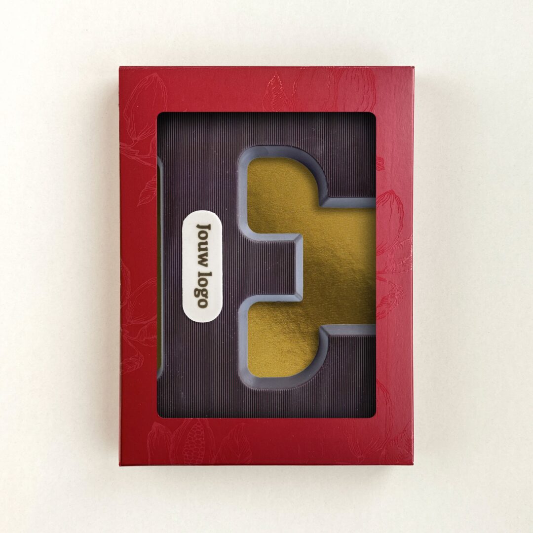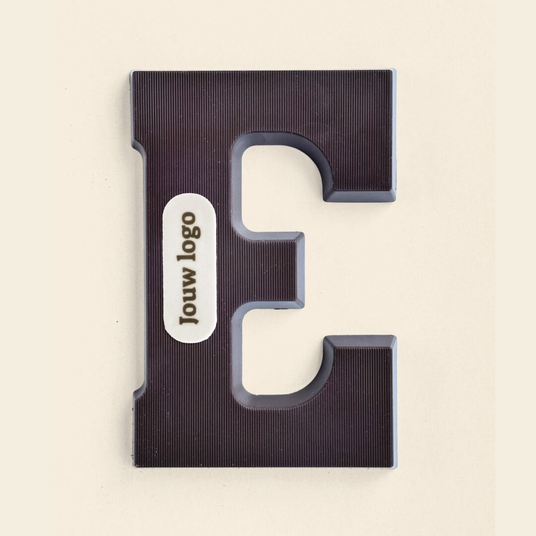 Jouw foto, bedrijfslogo of persoonlijke wenstekst op een pure chocolade letter E, d.m.v. een marsepeinen schildje (7 x 2,5 cm). De pure letter weegt 200 gram, wordt verpakt in een luxe rode geschenkdoos en is gemaakt van Belgische duurzaam geproduceerde Cocoa Horizons chocolade.