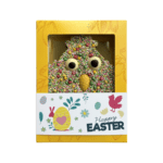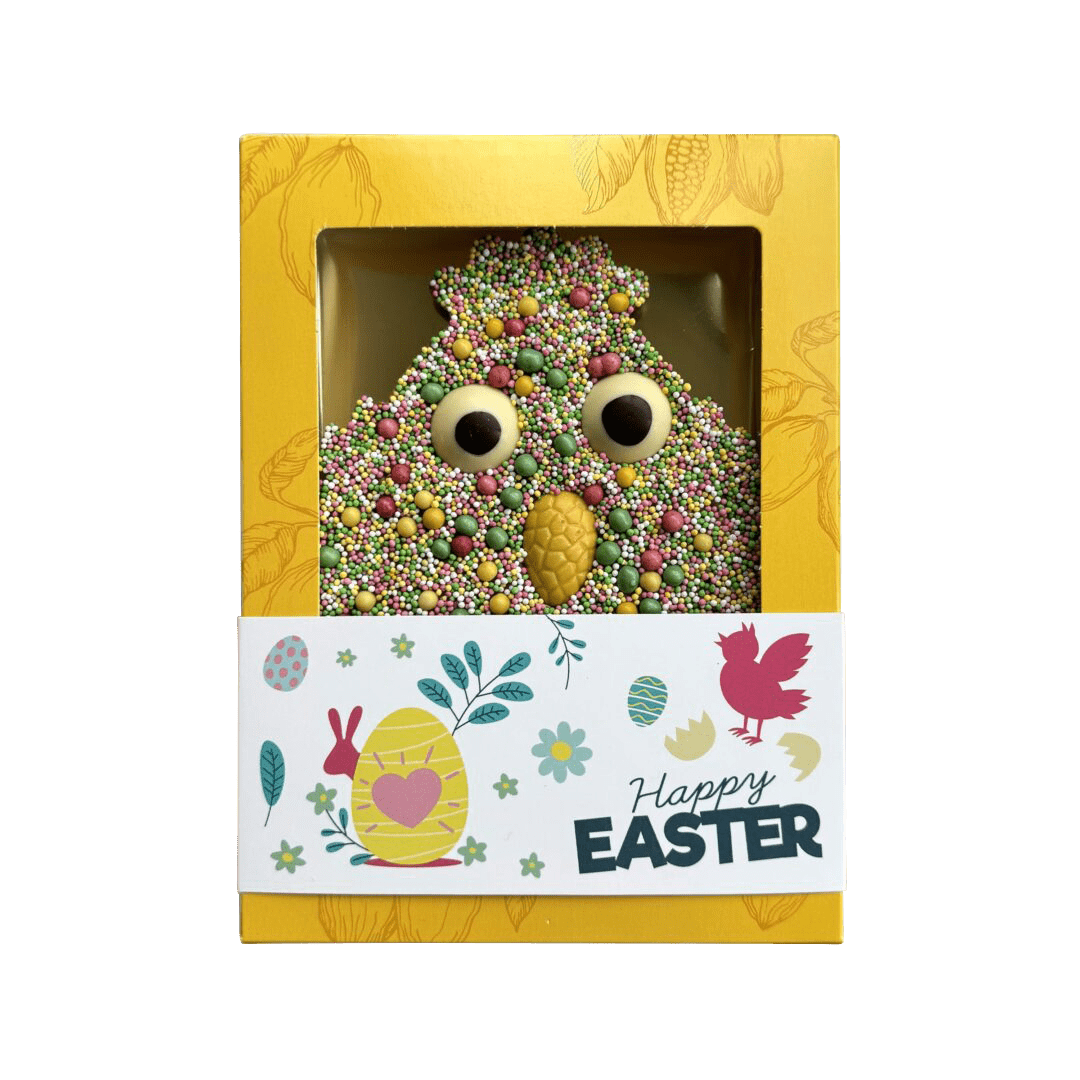Wat een kuiken! Een paaskuiken van chocolade, afgewerkt met vrolijke paasdecoratie. Decoratie-dip in vrolijke paaskleuren.