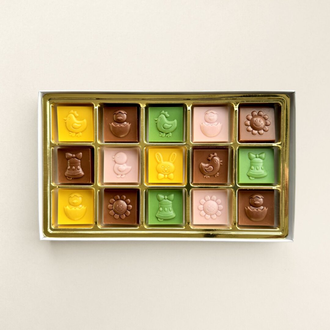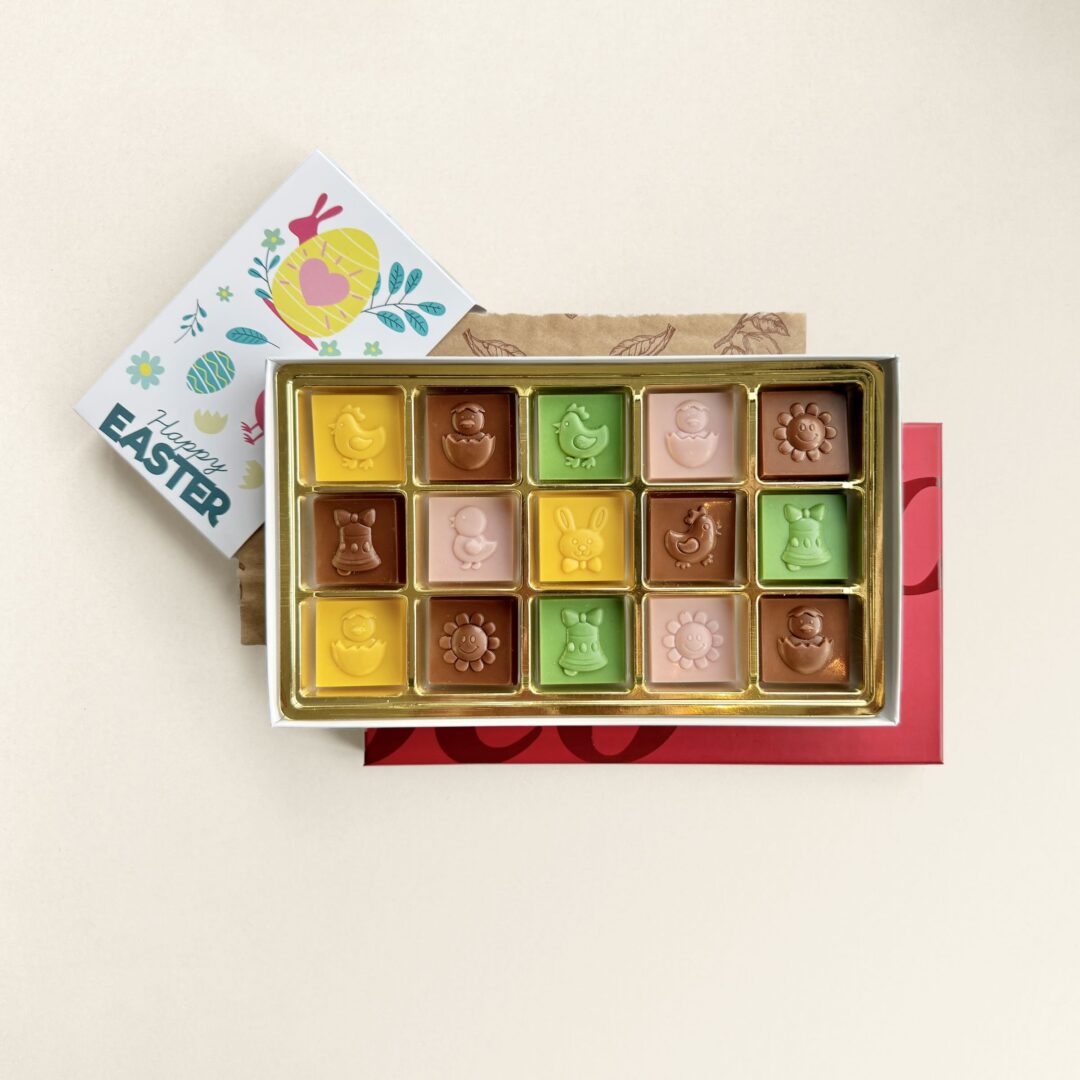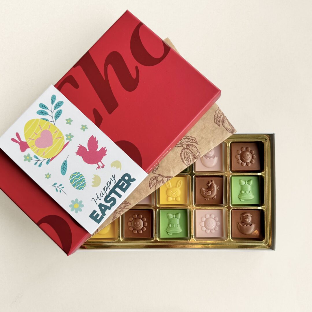 Een geschenkdoos, heerlijk gevuld. Vrolijke chocolade decoraties voor Pasen, in verschillende kleuren. Niet alleen verrukkelijk, ook een lust voor het oog. Op zoek naar een Paasmailing? Op dezelfde dag bezorgd, op één adres of duizend? Eenvoudig te bestellen.